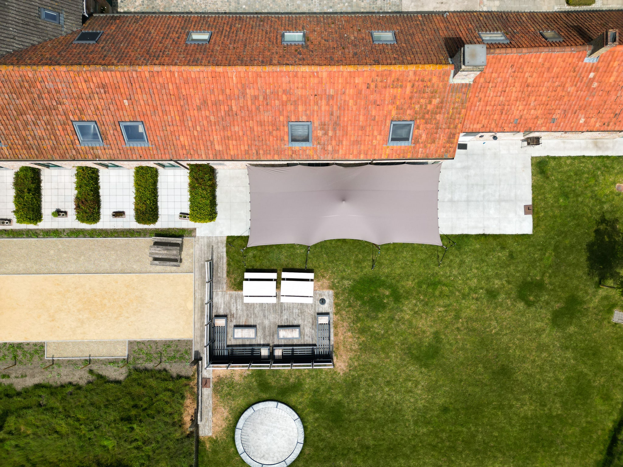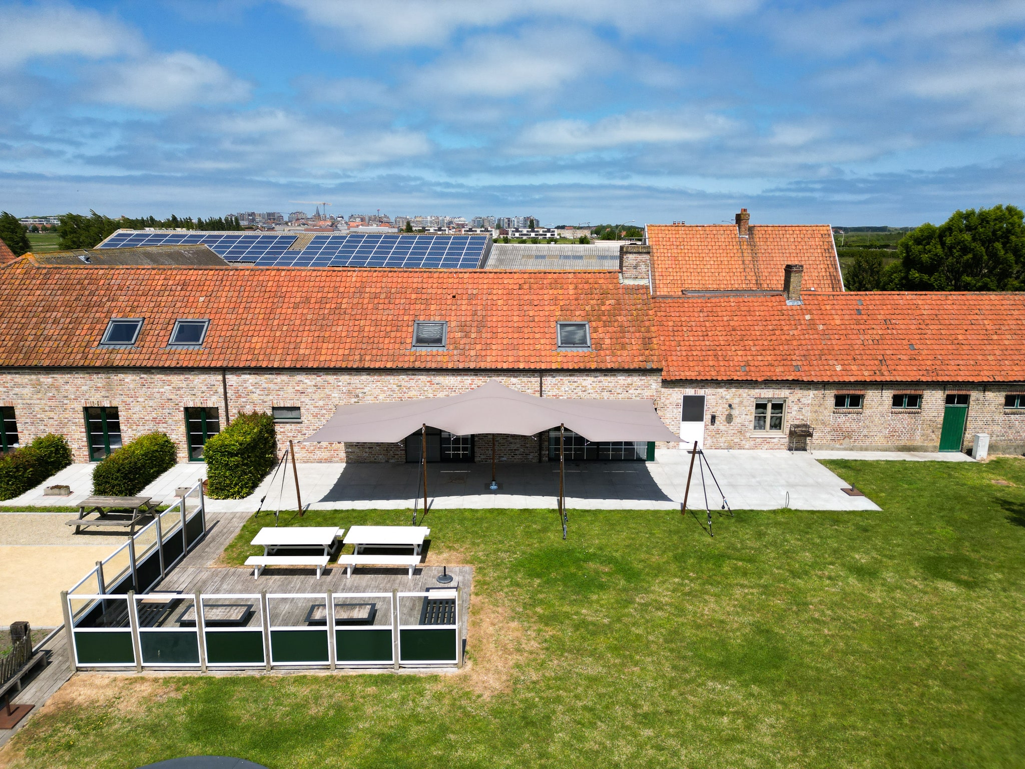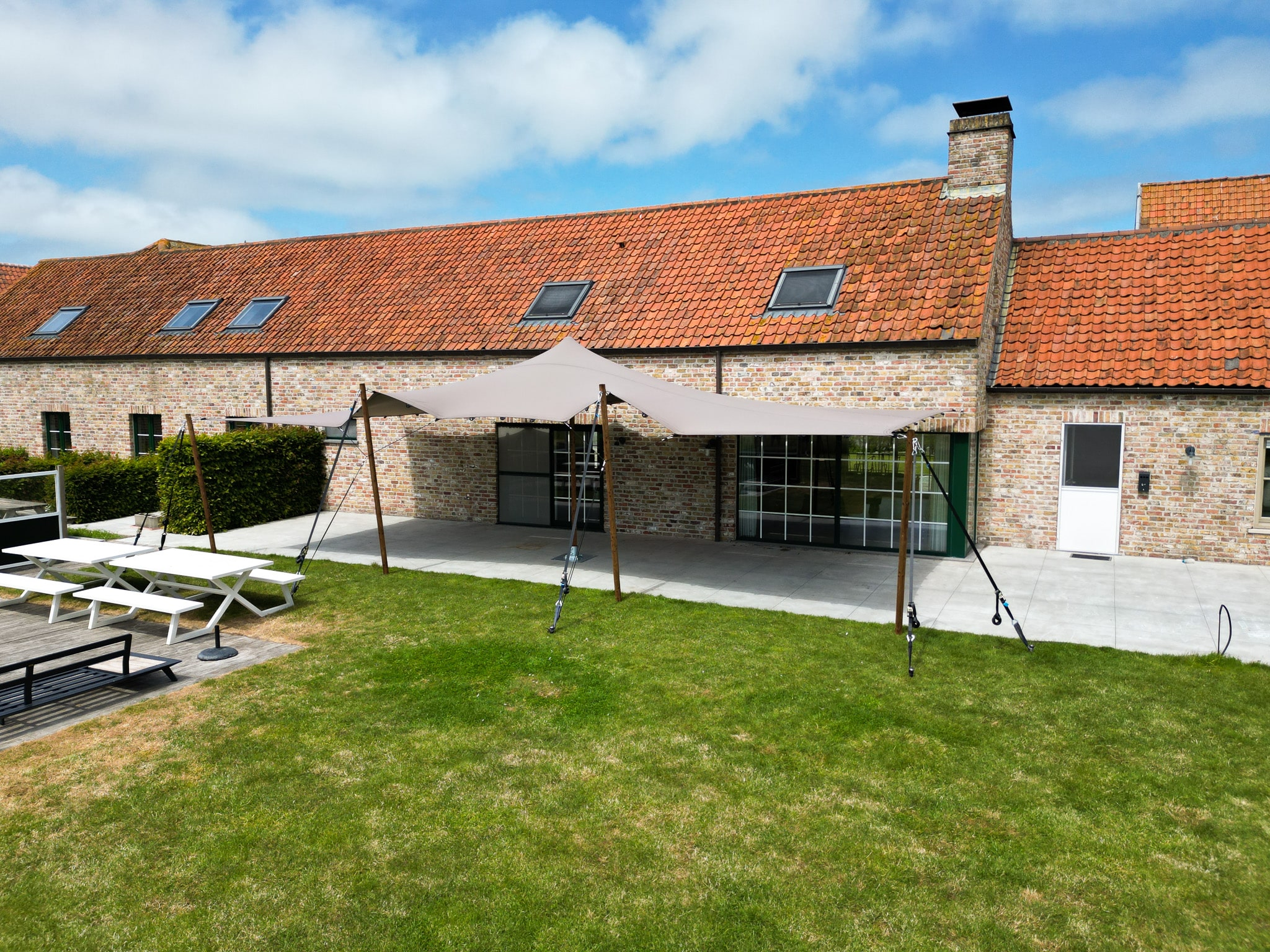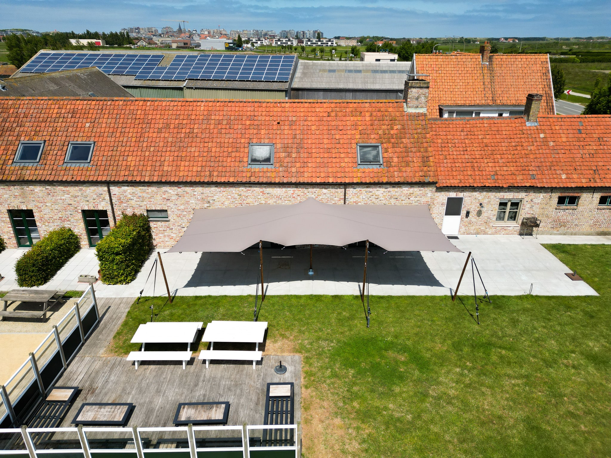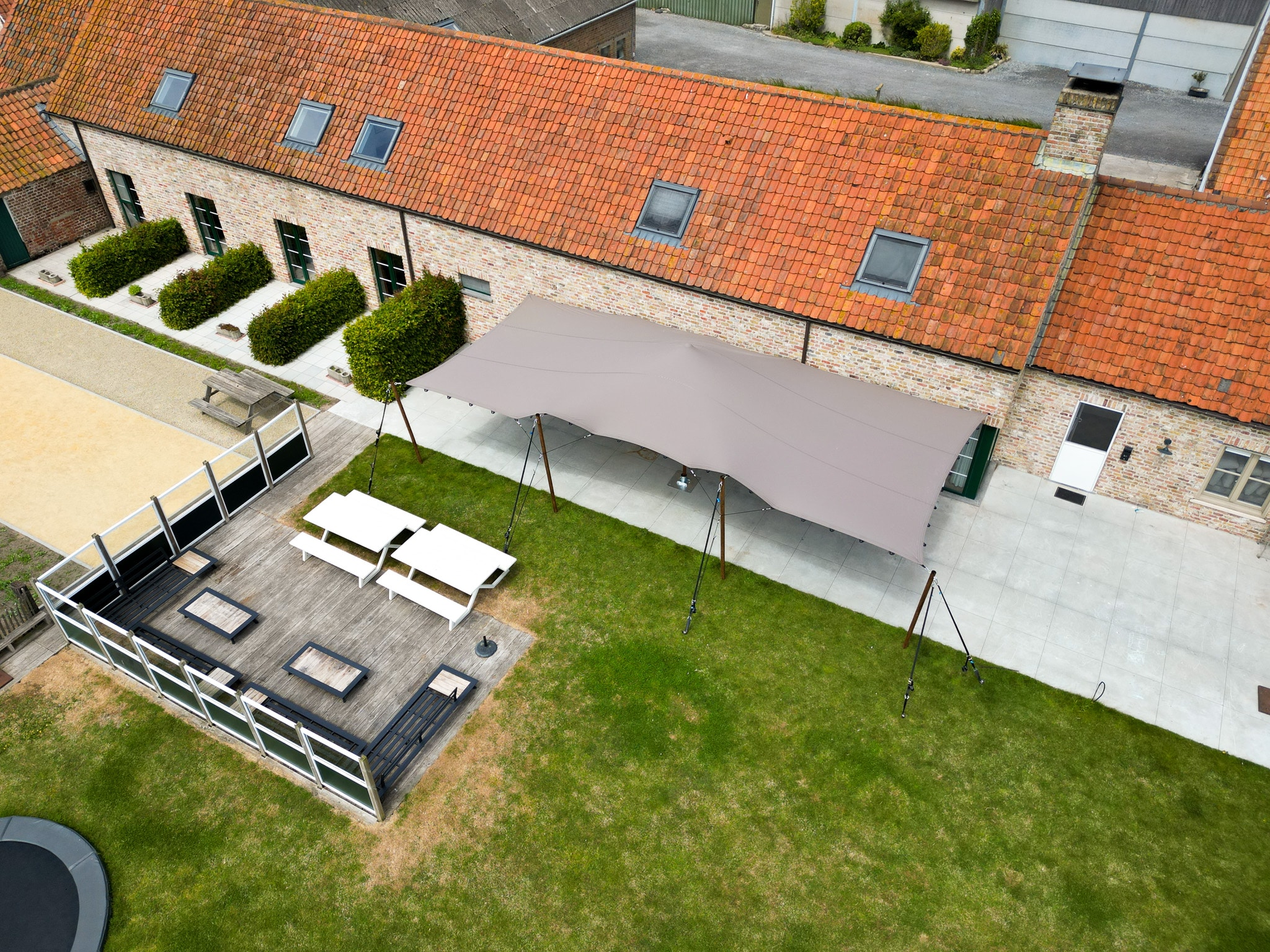 En medio del verde paisaje de Bélgica se encuentra la Casa rural Langhof, un encantador espacio de recreo donde la tranquilidad y el descanso son protagonistas. Para aprovechar al máximo el área exterior, se eligió una carpa beduina color topo de 4,5 × 11 metros.
